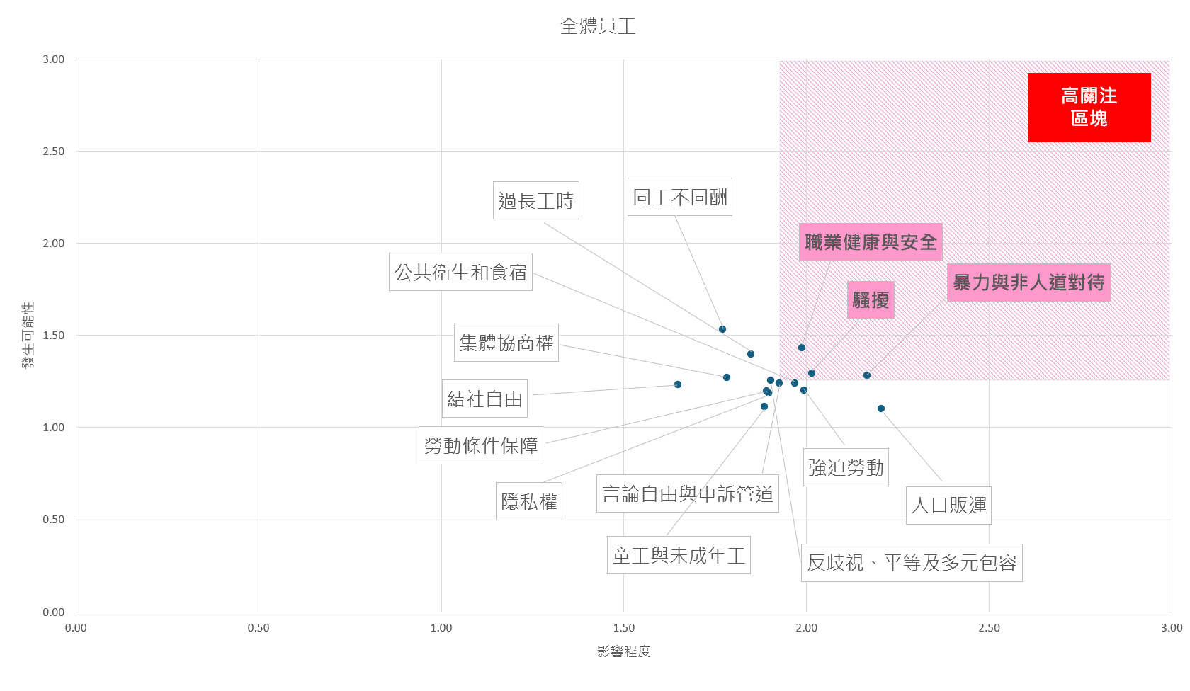 英業達人權盡職調查採行每兩年一次的調查頻率,其議題來源參考並彙整保護人權相關的國際準則、公司內部規定或辦法,以及相同產業與標竿企業所關注之人權議題,藉此鑑別出產業中具共通性之議題,並進一步發展各議題可能產生之負面情境,透過調查評估其對公司可能造成的衝擊程度,排序出最應關注的人權議題。公司將針對高度關注之議題擬定相關措施,並將人權議題納入日常管理思維。詳細內容請參閱英業達人權盡職調查報告。