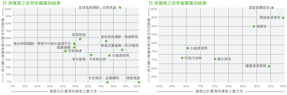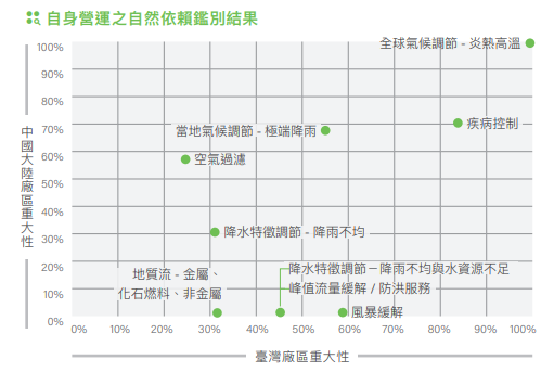 從聯合國環境經濟會計系統(UN System of Environmental Economic Accounting,SEEA)的22項依賴類別中,鑑別出臺灣廠區及大陸廠區皆關注的五大自然依賴議題,包含全球氣候調節-炎熱氣溫、疾病控制、當地氣候調節-極端降雨、空氣過濾(空氣品質下降)以及降水特徵調節 -降雨不均等,其中又以全球氣候調節-炎熱氣溫為最受關注議題。