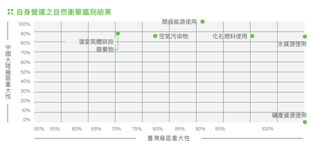 依據SEEA中之16項衝擊類別進行鑑別。雖臺灣廠區與大陸廠區鑑別出的自然衝擊類別優先順序不同,但主要關注的項目以水資源使用、間接能源使用(電力為主)、化石燃料使用、空氣污染、溫室氣體排放、廢棄物產生等六項重大性自然衝擊類別。